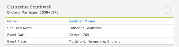 The other is for a Catherine Southwell, to Jonathan Mason, on the 30th April 1769, at St. Andrew’s, Mottisfont, Hampshire, England.