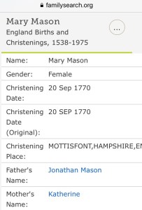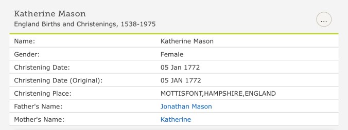They named her Catherine Kitty Mason and she was christened at St. Andrew’s, Mottisfont, Hampshire, England, on the 5th January 1772.