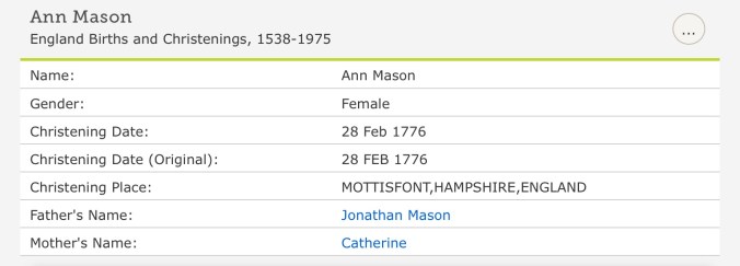 Ann was born about 1776 and was christened at St. Andrew’s, Mottisfont, Hampshire, England, on the 28th February 1776.
