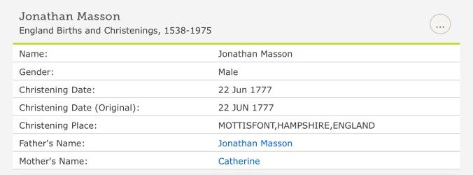 Jonathan was christened at, St. Andrew’s, Mottisfont, Hampshire, England, on the 22nd June 1777.