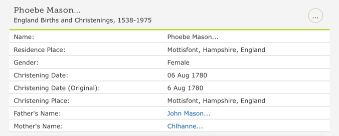 Phoebe was christened at, St. Andrew’s, Mottisfont, Hampshire, England, on the 6th August 1780.