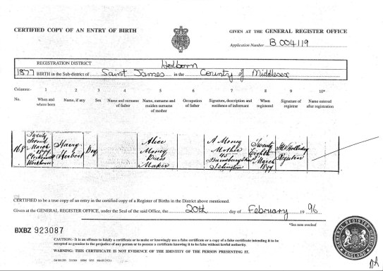 Alice registered Harry’s birth on the, 28th March 1877.