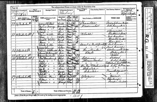 it’s now, 1881 the year of the census, and the next document I have for Harry. The census was taken on the 3rd April and shows, Harry Herbert, his brother George and his mother Alice, who was using her middle name Maria, were residing at Number 29, Nicholas Street, Hoxton Old Town, Shoreditch. They had a visitor staying with them, our one and only William George Willats, my 3rd Great-Grandfather.