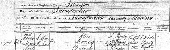 Arthur Richard Money, was born at number 24, Chatterton Road, Islington, Middlesex, England.