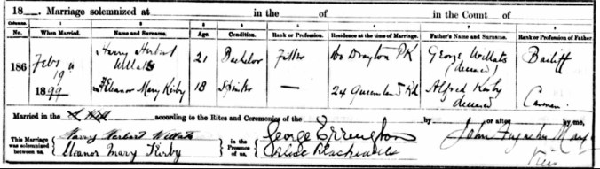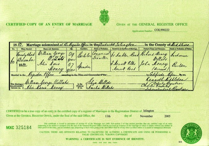 Harry Herbert, George and Arthur’s parents, Alice Maria Money and William George Willats, finally marry on the, 23rd December 1882, at the Register Office, Islington.