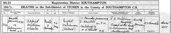 Alfred William Wheeler, died on 4th January 1933, at Number 13 Laburnum Road, Southampton, Hampshire, England, when he was 76 years old.