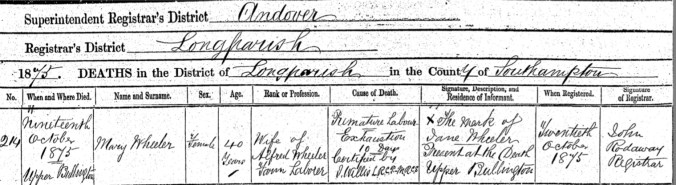 Jane Wheeler was present at her death and registered it on, October 13, 1875. Her Husband Alfred, was working as a Farm Labourer, at the time of her death.