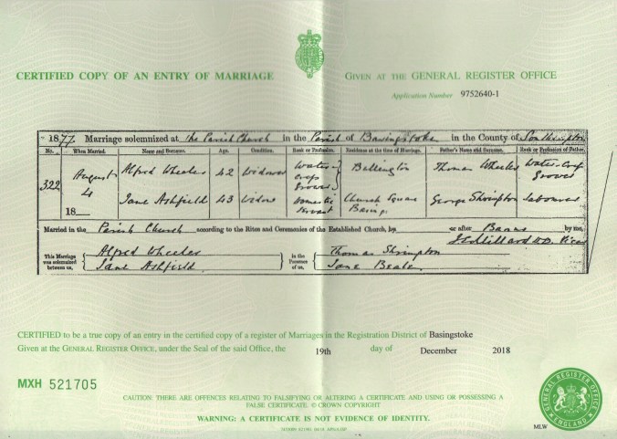 Alfred’s Father Alfred, remarried. He married Jane Ashfield Nee Shrimpton, on the 4th August 1877 when he was 42 years old and a Widower.