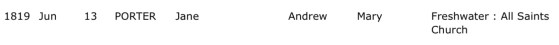 Andrew and Mary Porter, christened John at, All Saints Church, Freshwater, Isle of Wight, Hampshire, England, on February 15, 1807.