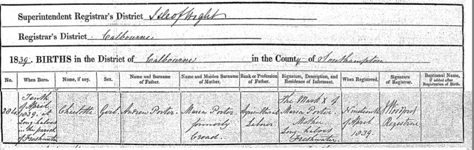Andrew and Maria’s Daughter, Charlotte Porter, was born on the 10th April 1839 at, Longhalves, Freshwater, Isle of Wight, Hampshire, England.