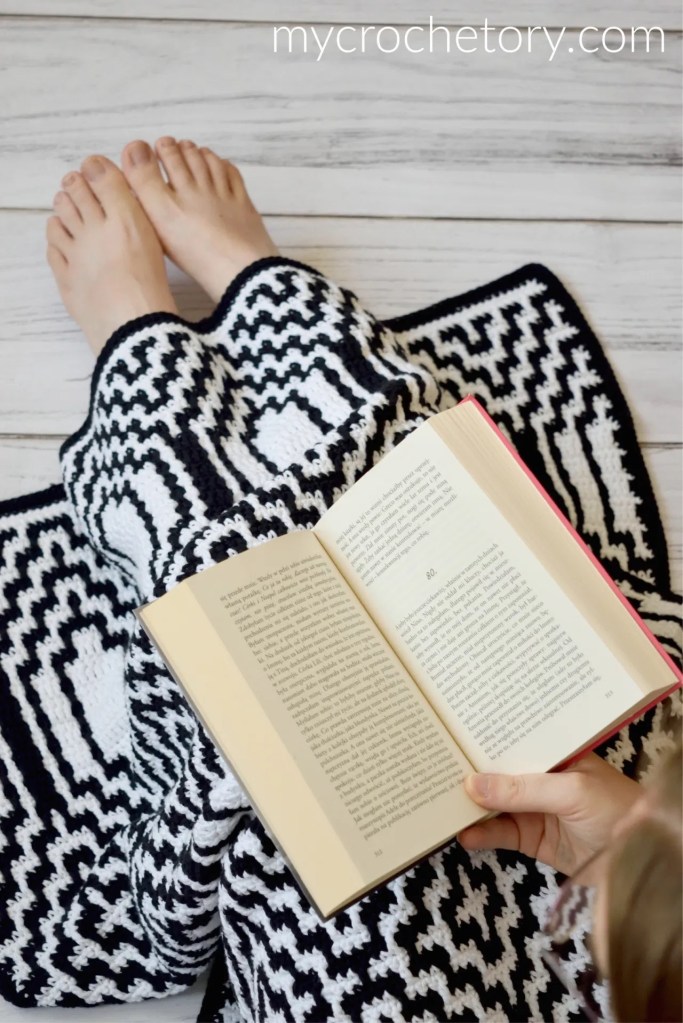 The blanket is made with the two row mosaic technique, working back and forth in rows meaning there are no pesky ends to weave in, as you carry the yarn up the sides as you go.