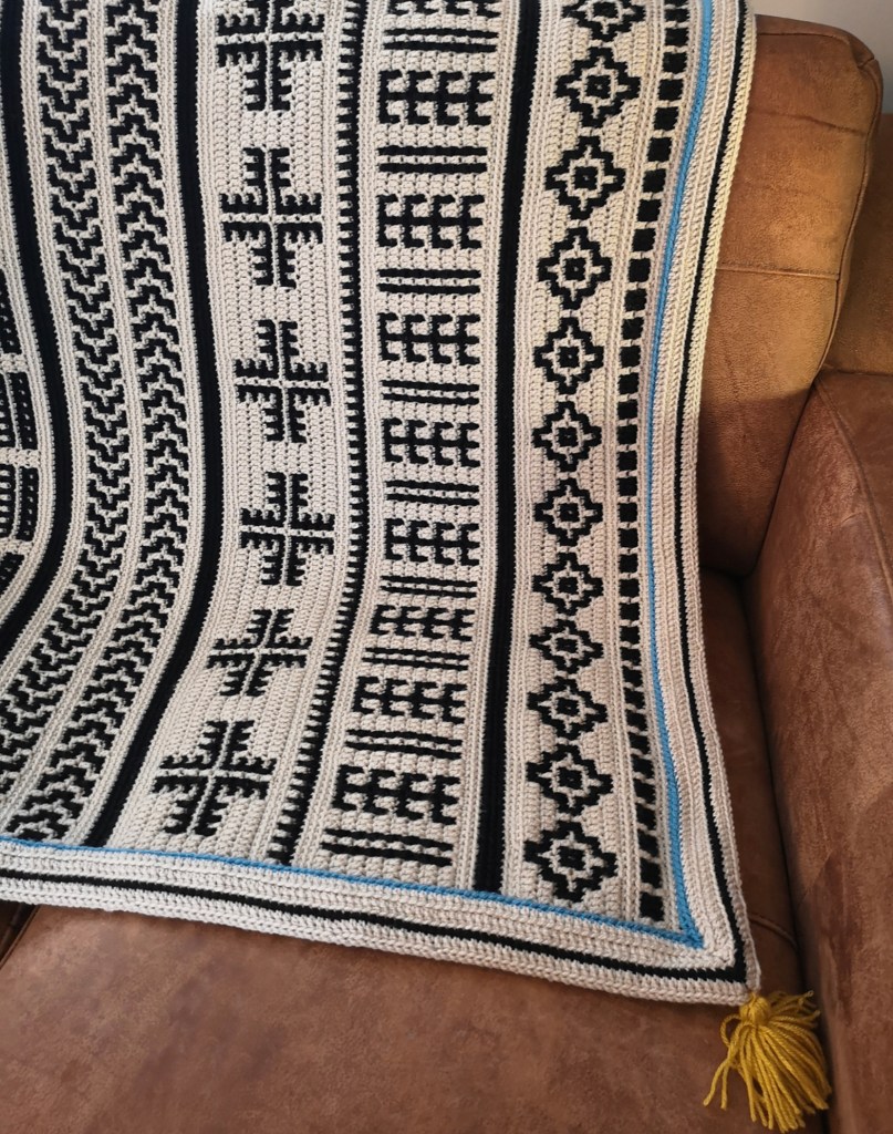 The Berber Afghan, is created using overlay mosaic technique. Mosaic crochet does not require you to turn your work. You start each row from the right-hand side on every row, work your way across using either single crochet and double crochet stitches, always starting and finishing off with a single crochet in both loops and cut your yarn.