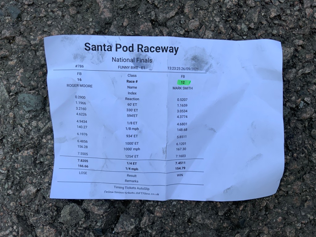 Smithy was up against Roger Moore. As you can see below Roger had a good reaction time of 0.2900. Smithy was a tad slower off the line, with a reaction time of 0.52. The bike shifted left again. Smithy pulled it back and took the win with 7.45seconds at 154mph.