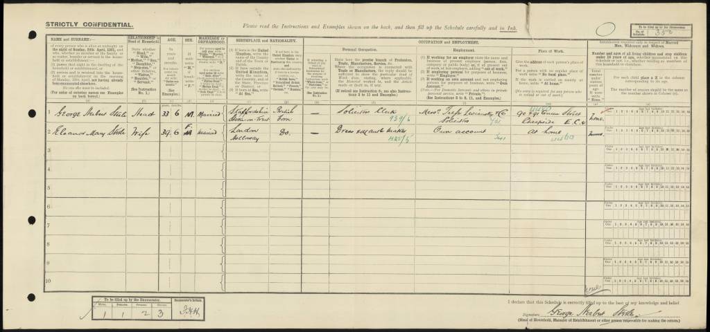 Eileen was working of her own account, at home, as a Dress & Mantle Maker. George was working as a Solicitor Clerk for Messrs Teeple Leviantley & Co Solicitors, 90 & 91 Queens Steet, Cheapside, London, England.
