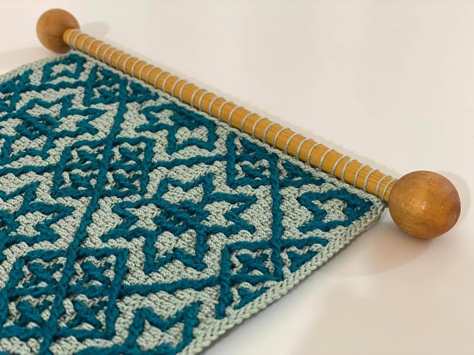 I than made 34 rows of single crochet in the back loops, also starting and finishing with a border stitch, changing my yarn from A to B at the end of each row.