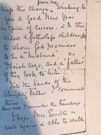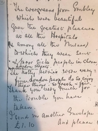 The evergreens from Embley which were beautiful gave the greatest pleasure at all the hospitals (& among all the nurses) to which they were sent & poor sick people in close London streets. The holly berries were very fine London people do so enjoy these things, so fresh & fair. Thankyou very much for the trouble you have taken. I send in another envelope £1.10 and please keep the change from me wishing to you a good new year in spite of sorrow & to the widow & fathers children too to whom God promises to be a “husband” as Isaiah says a “father” if they took to him into the hands of the almighty Father, I commend them.