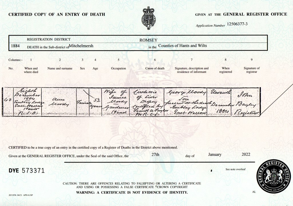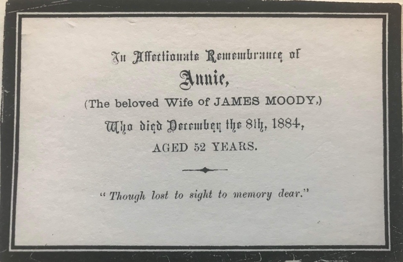 James’s beloved wife Ann who passes away on 08/12/1884 aged only 52 years old. Ann died from, Cirrhosis of the liver and dropsy.