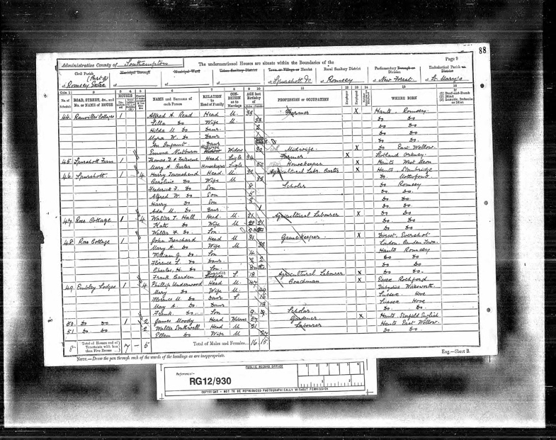 In 1881, James, Ann and their daughter Ellen are still living at Embley Lodge, Embley, East Wellow. James is still employed as Head Gardner.