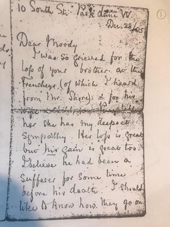 I was so grieved for the loss of your brother at the Frenches ( of which I heard from Mr Shore) & for his wife please tell her she has my deepest sympathy. Her loss is great, but “his” gain is great too. I believe he had been a sufferer for sometime before his death. I should like to know how they go on.