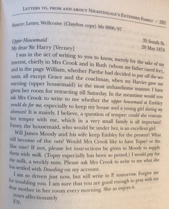 In a letter written to Sir Harry Verney from her London residence on the 20th of May 1874 I think after her mother passed away it says,
