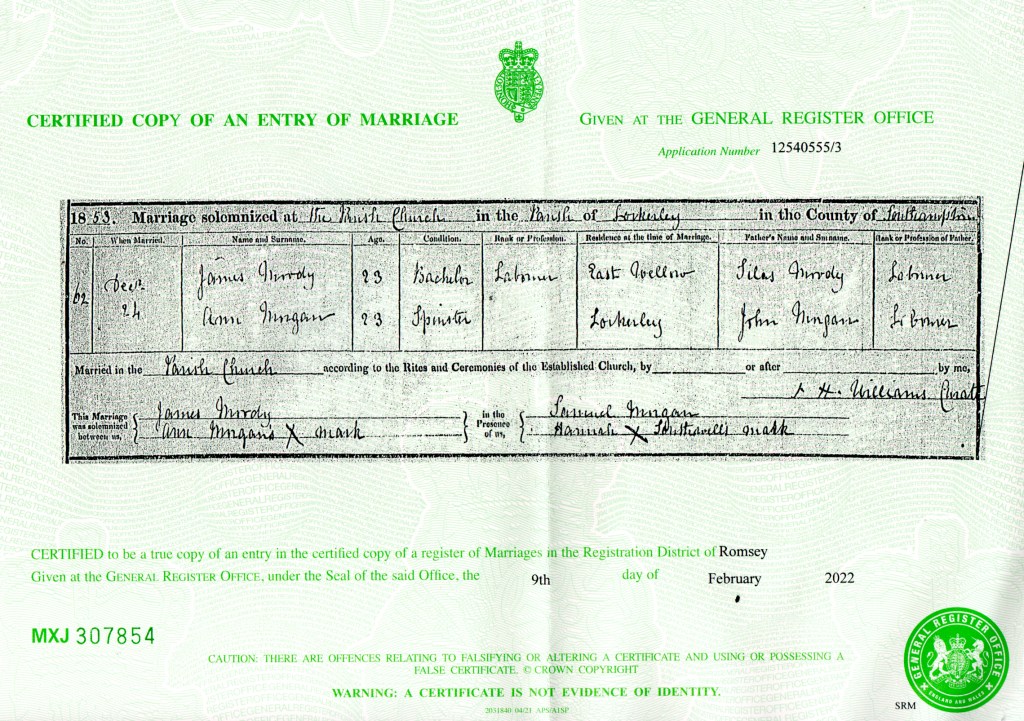 James’s life is changed forever when he meets his sweetheart Ann Morgan, from Lockerley. They have their banns read on 20/11/1853 at Lockerley church then go on to marry in the bride’s parish on 24/12/1853.