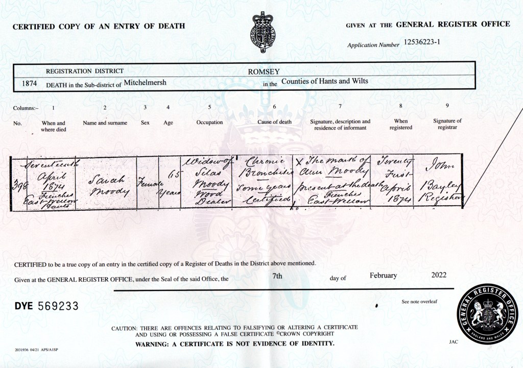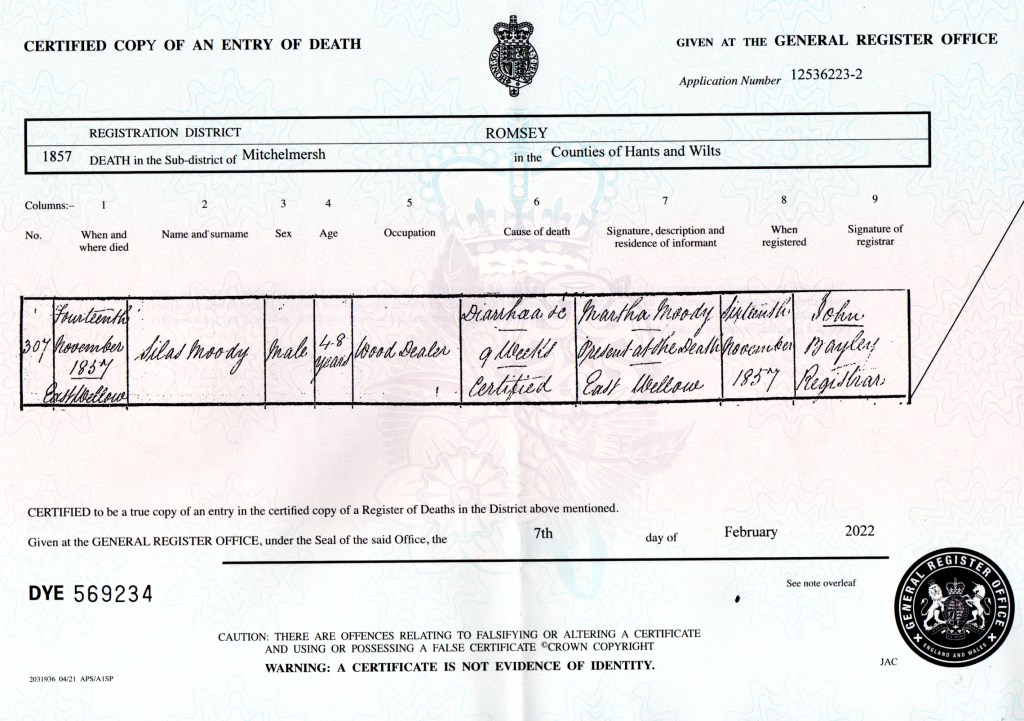 Sadly, Silas James’s father passed away a year later on the 24/11/1857, at East Wellow, aged 48 he was buried on 18/11/1857) at, Wellow Church.