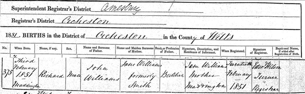 On Monday the 3rd of February 1851, in Middington, Amesbury, Wiltshire, England, Jane gave birth to their Son, Richard Williams. Jane registered his birth on the 20th February 1851. John was working as a butcher, at the time of Richards birth.