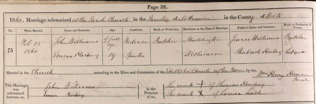 John and Emma married on Wednesday the 15th of February 1860, at The Church of All Saints, Netheravon, Salisbury, Wiltshire, England. Their witnesses were, Thomas Harding and Louisa Leach.