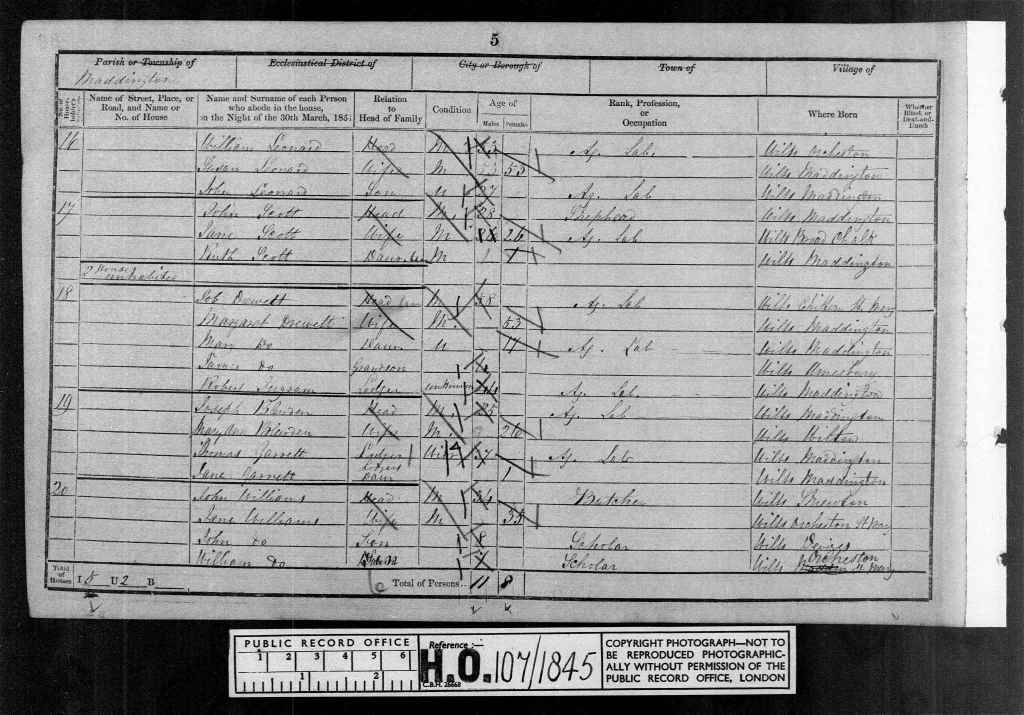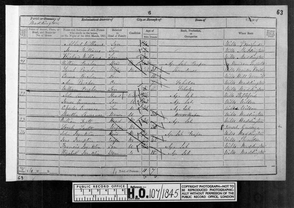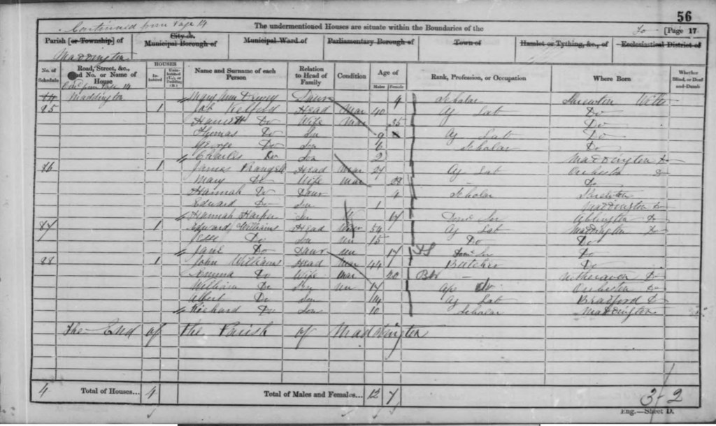 John and Jane Williams lived in Maddington, Amesbury, Wiltshire, England, on Sunday the 30th of March 1851, with their children, John, William, Albert, James and Richard. John was working as a Butcher.