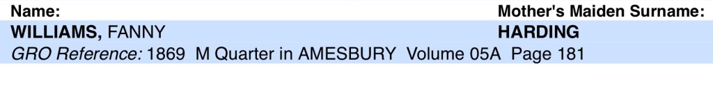 A few short years later, Emma gifts John, a second daughter, whom they call, Fanny Williams. Fanny was born on the 31st December 1868. Her birth is registered in the January-March quarter of 1869, in the Amesbury district of Wiltshire.