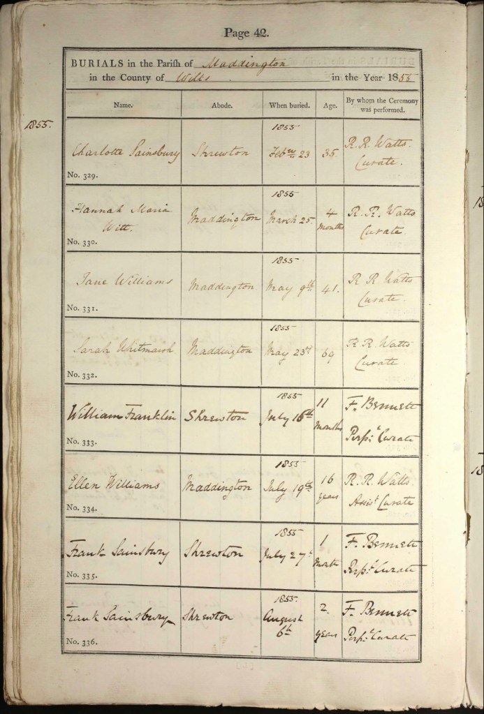John laid her to rest on, Wednesday the 9th of May 1855, at Maddington, Amesbury, Wiltshire. John was left to bring up their five Childen alone.