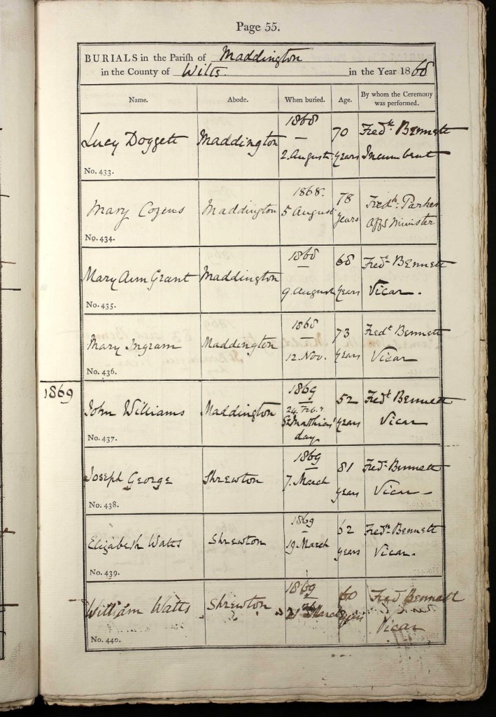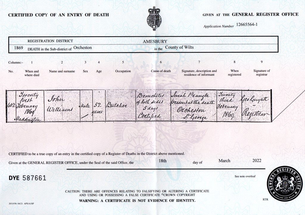 Letters of Administration of the personal estate and effects of John Williams, late of Maddington in the county of Wiltshire Butcher deceased who died 21 February 1869 at Maddington aforesaid were granted at Salisbury to Emma Williams of Maddington aforesaid Widow the relict of the said deceased she having been first sworn.