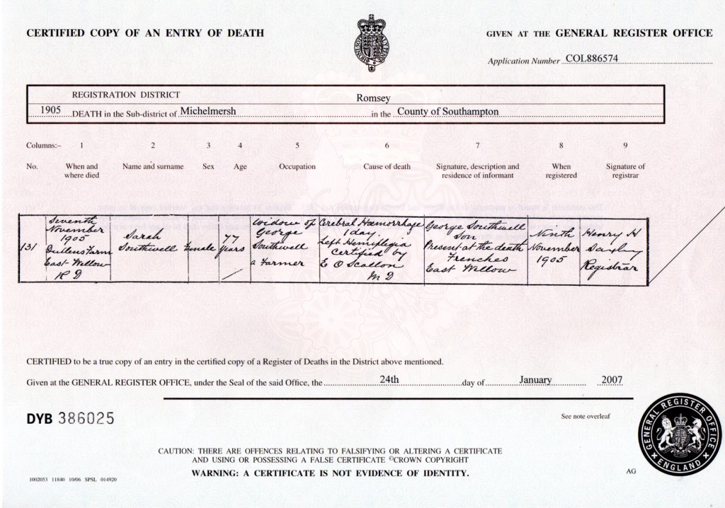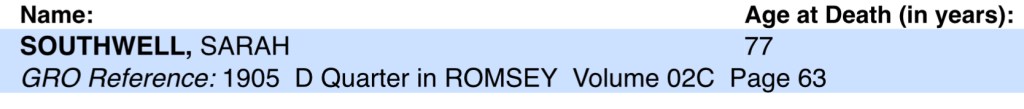 Alice’s brother, George Southwell, was present and registered her death on the 9th November 1905, in Romsey, Hampshire.