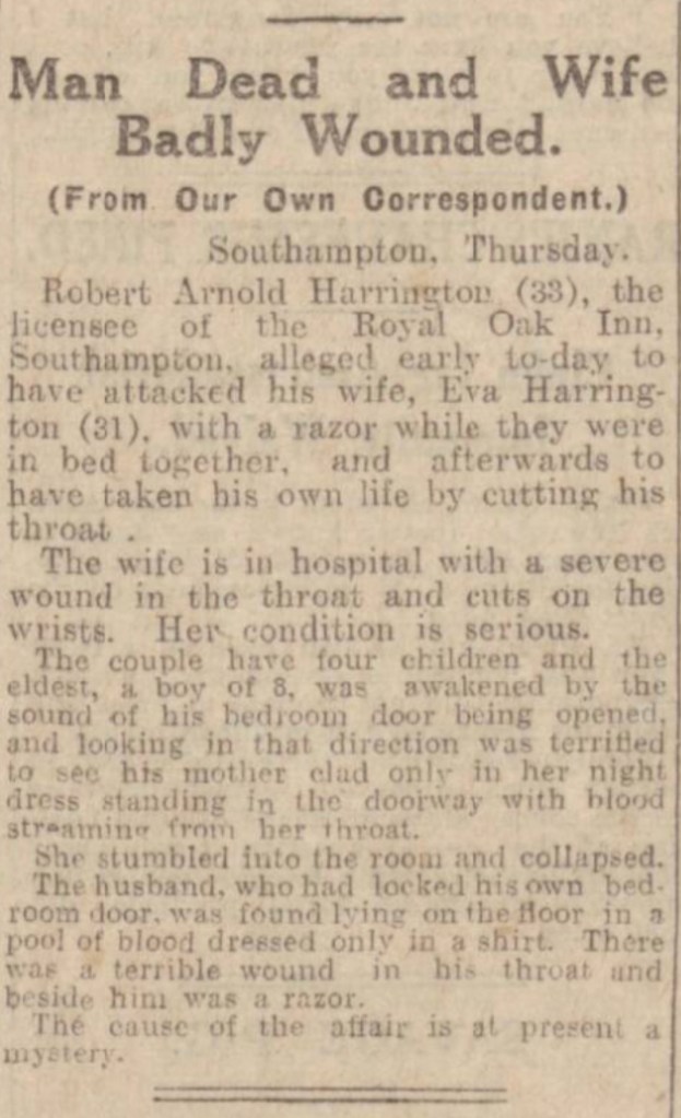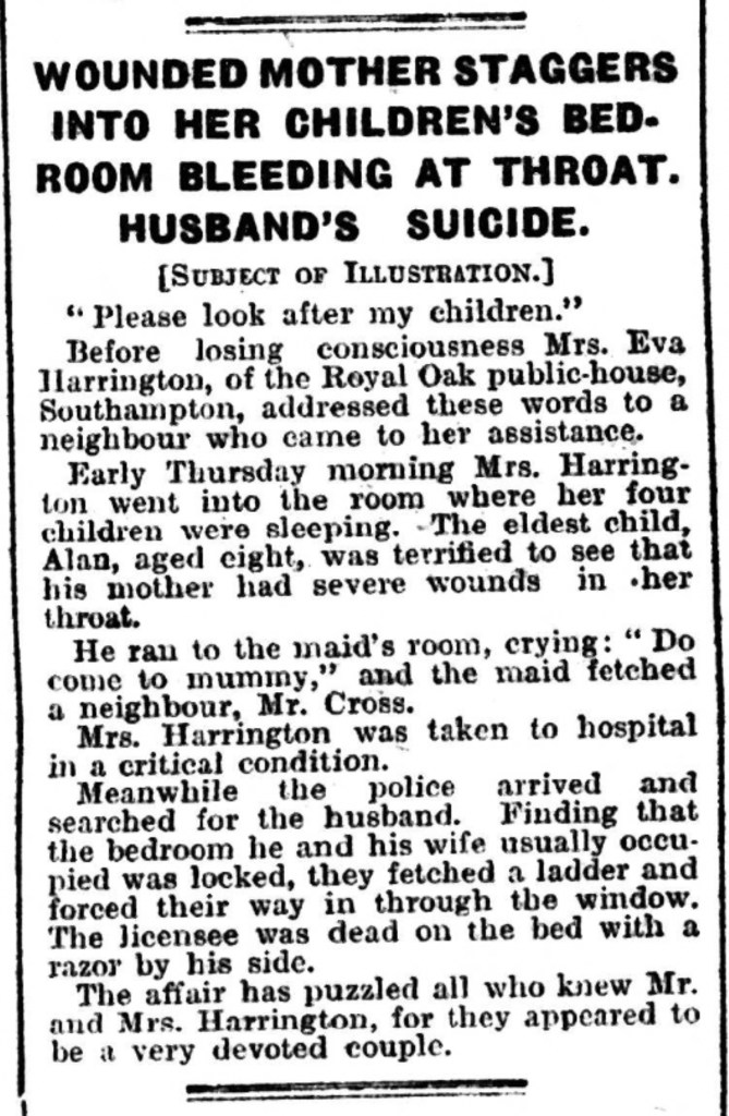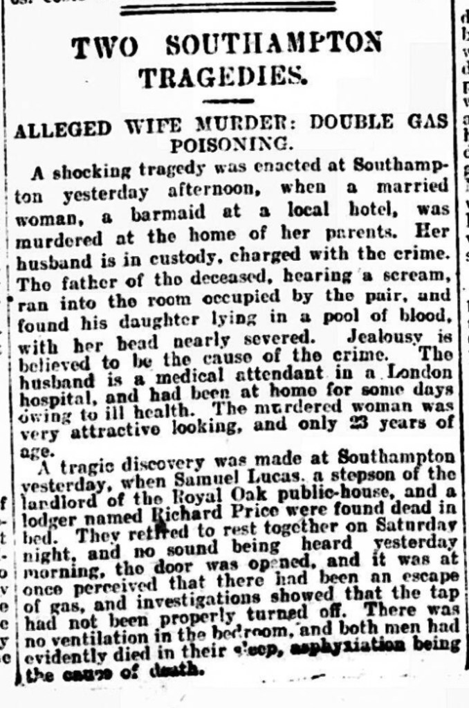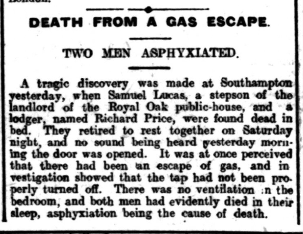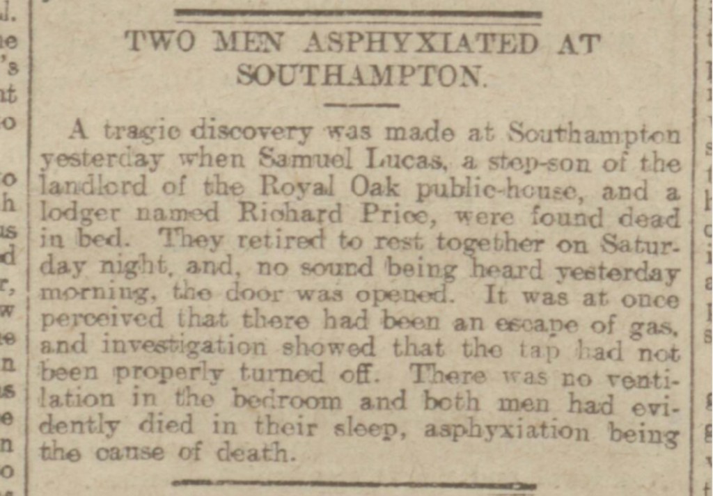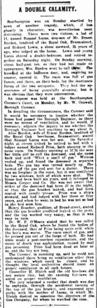 Southampton was on Sunday startled by news of another tragedy, which if less ghastly in character, was nevertheless most distressing. There were two victims, a lad of 14, named Samuel Lucas, step-son of Mr. Ernest Burden, landlord of the Royal Oak, Evens-street, and Richard Lewis, a shore steward, 35 years of age, who lodged at the home. Lewis and young Lucas shared a double-bedroom, and retired together on Saturday night. On Sunday morning, about half-past ten, as they had not made an appearance, Mrs Burden went to call them. She knocked at the bedroom door, and, receiving no answer, opened it. The room was full of gas fumes, and there, on their beds, lay the inanimate forms of the two occupants. They had the appearance of being peacefully sleeping, but it was obvious that they were unconscious.