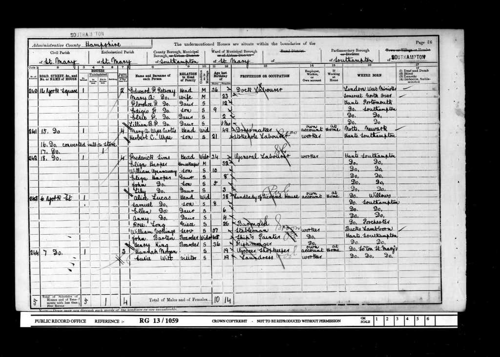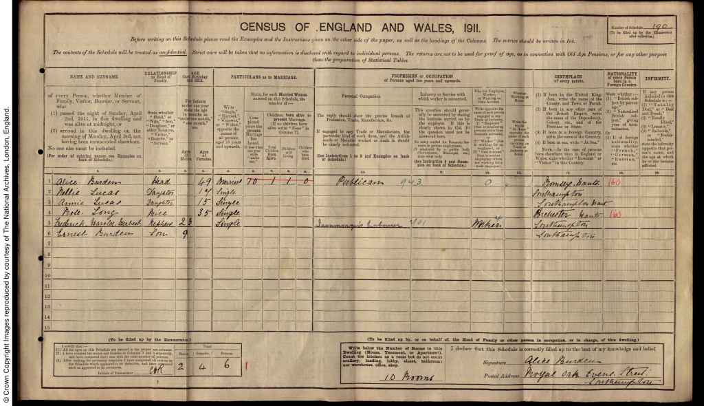 And the 1911 Census was taken on the Eve of Sunday the 2nd of April, which shows, Alice, her children, Ellen Lucas also known as Nellie, Annie Lucas and Ernest Burden, her niece Rose Long and nephew Frederick Harold Herbert, were residing at the Royal Oak, 5 York Square, St Mary, Southampton, Hampshire, England, a 10 room dwelling.