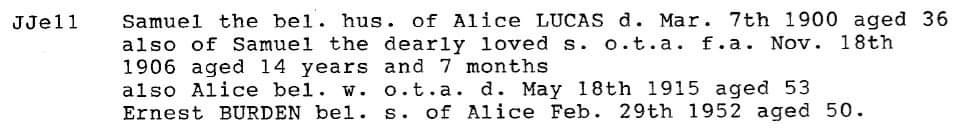 Alice was laid to rest with her 2nd husband, Samuel Lucas, and her Son, Samuel Lucas, at Southampton Old Cemetery, Hill Lane, Southampton, Hampshire, England, in Row N, Block 150, Number 201, on the 22nd May 1915.