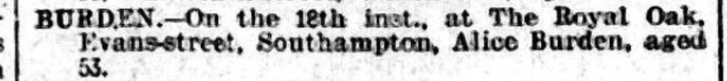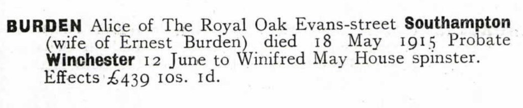 BURDEN Alice of The Royal Oak Evans-street Southampton (wife of Ernest Burden) died 18 May 1915 Probate Winchester 12 June to Winifred May House spinster. Effects £439 10s. 1d.