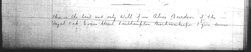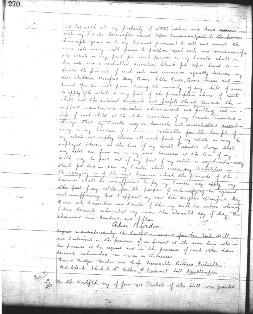 This is The last will and only will of Alice burden of the Royal Oak, Evans Street, Southampton Beer-house keeper. I give devise and bequeath all my property of what nature and kind soever unto my ……. hereafter ….. upon trust subject to the powers hereafter given as my licensed premises) to sell and convert the same into money with power to postpone such sale and conversion of the whole or any part such …… as my trustee shall in her sole and controlled discretion think fit upon trust to divide the proceeds of such sale and conversion equally between my dear children Winifred May House, Ellen Lucas, Annie Lucas and Ernest Burden with power during the minority if any child of mine to apply the whole or part of the presumptive share of such child and the interest dividends and profits thereof towards the support maintenance education advancement and putting out in life of such child at the like discretion of my trustee provided always that my trustee may in her sole and uncontrolled discretion carry on my business of a licensed victualler for the benefit of my estate and employ therein all such parts of my estate as my trustee may think fit and in case my trustee shall incur any liabilities in ……. The carrying on of the said business which the proceeds of business shall be insufficient to pay my trustee may apply any other part of my estate for the purpose of indemnifying her against such insufficiency. And I appoint my said dear daughter Winifred May House sole executor and trustee of this will in witness whereof I have here unto subscribed my name this eleventh day of May one thousand nine hundred and fifteen