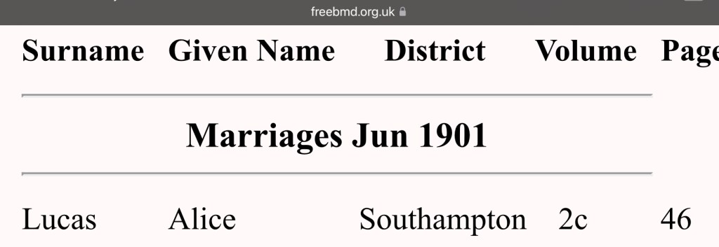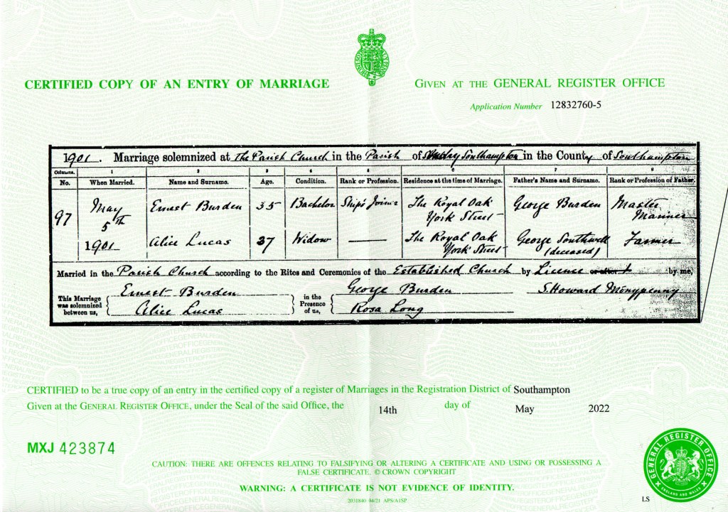 It wasn’t long before Ernest had a engagement ring on her finger, and on the 5th May 1901, when she was 37 years old, Alice and Ernest tied the knot, at St. Mary’s Church, St Mary’s, Southampton, Hampshire, England.