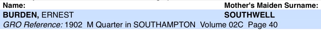 A short while after, Alice found herself in the family way and gave birth to a son on the 10th February 1902, in Southampton, Hampshire, England. Alice named him, Ernest Burden.