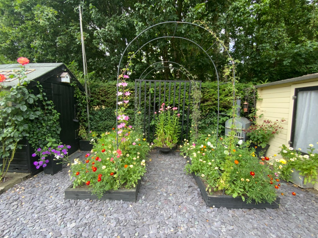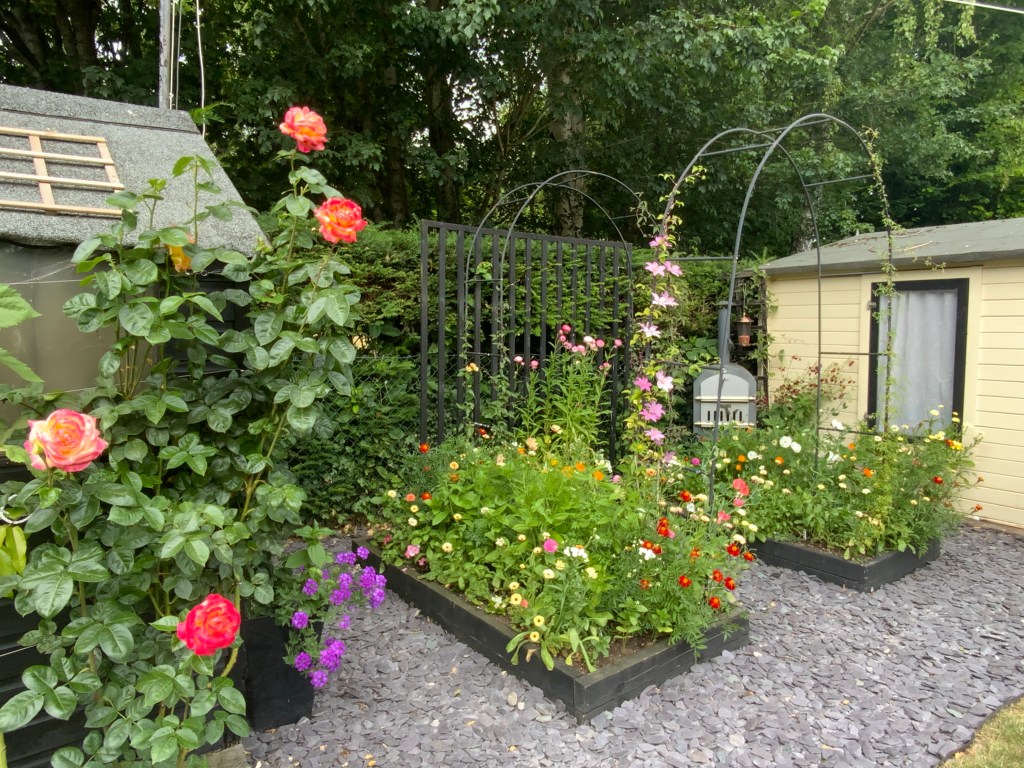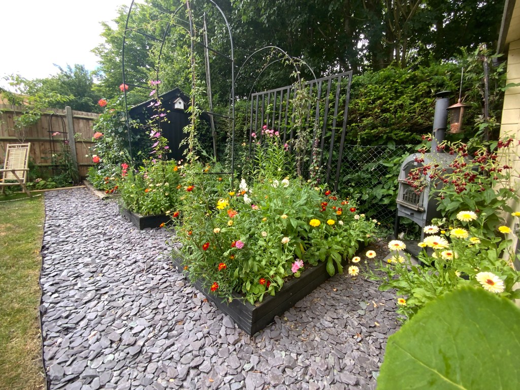 When we first moved in, we laid a gorgeous new lawn. It wasn’t long until the humongous trees behind our garden well and truly killed it. During lockdown battled the area. We brought two tons of grey slate to cover up the nonexistent grass mud section and made raised borders in hopes to grow our own vegetables, which we failed miserably at, due to slugs 🐌 and caterpillars. 🐛The butterflies were a joyful bonus.🦋