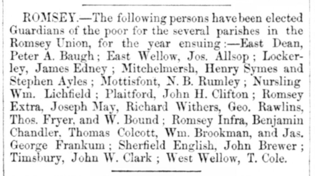 Romsey held elections for the Guardians of the poor. James Edney had been elected for the parish of Lockerley.