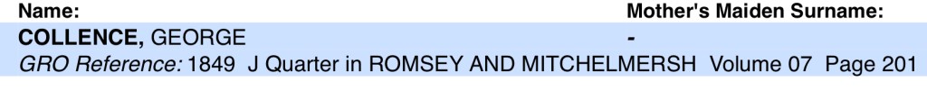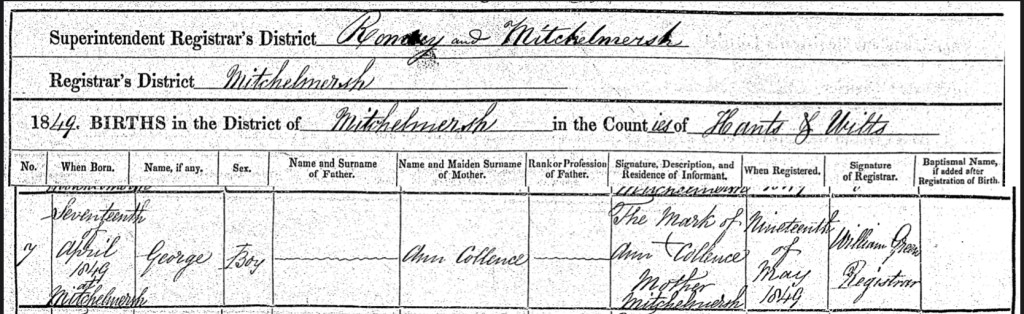 The birth certificate confirm, that Christians Grandson, George Collins was born on Tuesday the 17th of April 1849, at Mitchelmersh, Hampshire, England.