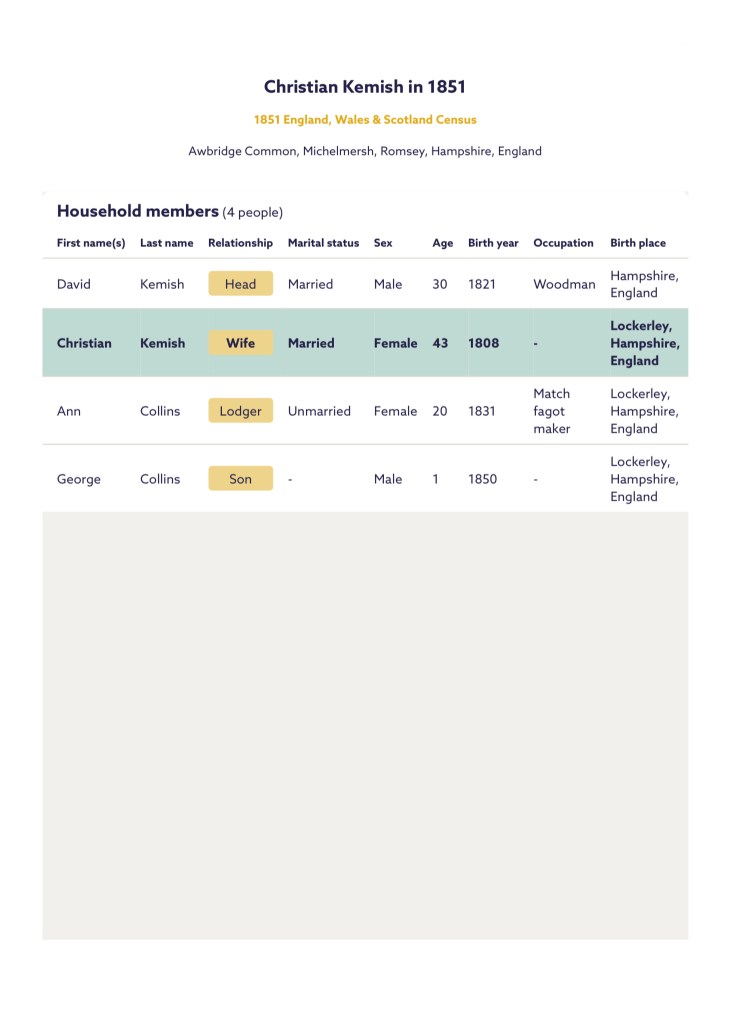 And of course the 1851 census was taken on Sunday the 30th March, which shows, Christian was residing at Awbridge Common, Mitchelmersh, Romsey, Hampshire, England, with her husband David, her daughter Ann and Grandson, George Collins (Anne’s son).