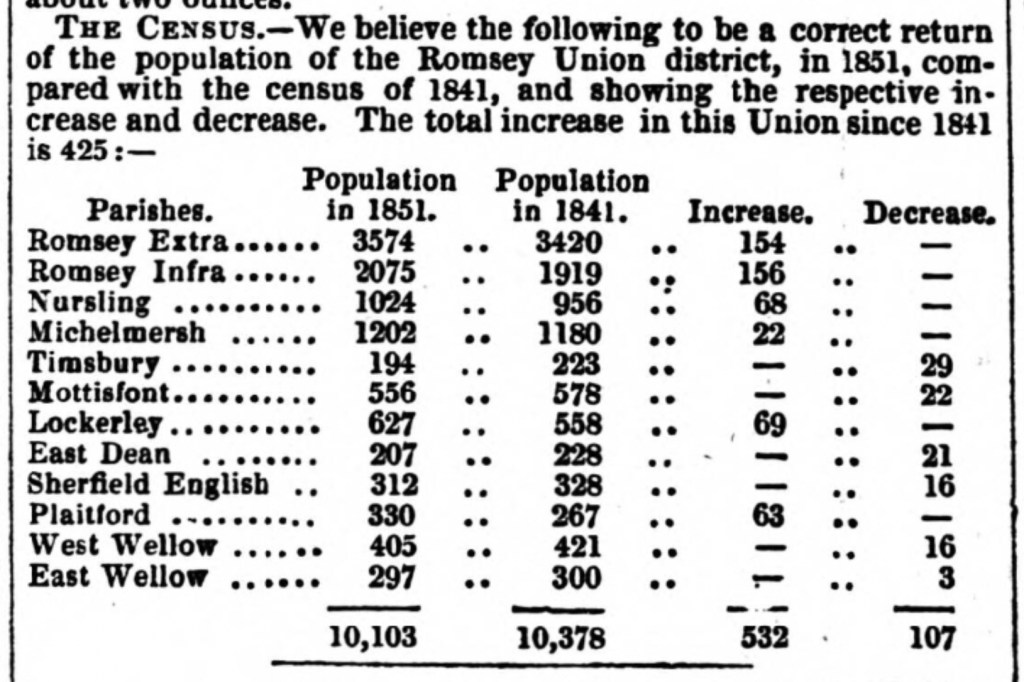 After the census, on the 19 April 1851, the Hampshire Advertiser printed the below information about the increase and decrease in the population.
