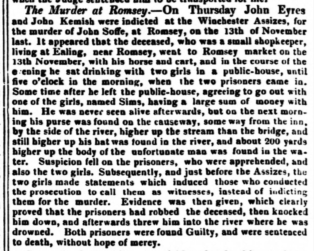 John Soffe an inhabitant of the village of Minesteed was murdered in Romsey, by John Eyres, John Kemish, Emma Leach and Mary Ann Sims.
