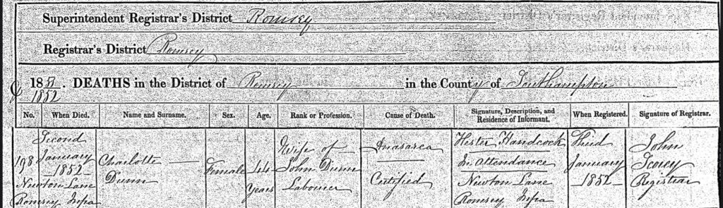 Hester Handcock, was in attendance and registered her death on Saturday the 3rd January 1852, in the market town of Romsey, Hampshire.