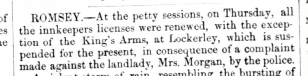 1. Hi – genealogy is always fascinating. I’m interested in a passing comment – you include a cutting reporting “All innkeepers licenses were renewed in Romsey and Romsey Extra, apart from the Kings Arms in Lockerley, which was suspended in consequence of a complaint made against the Landlady, Mrs Morgan, by the police.”