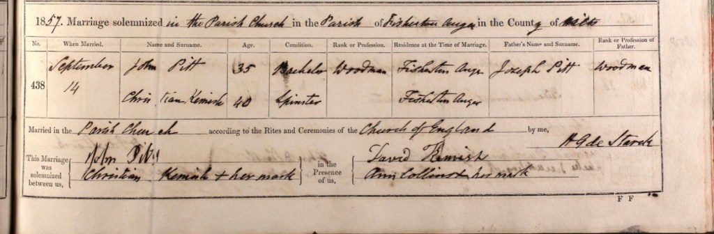Just over five and a half years later, Christian, sat in church besides a gentleman named, John Pitt, son of, Joseph Pitt and Elizabeth Pitt nee Moody and heard their marriage banns be called.