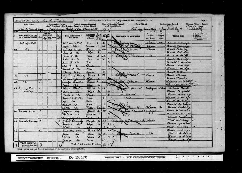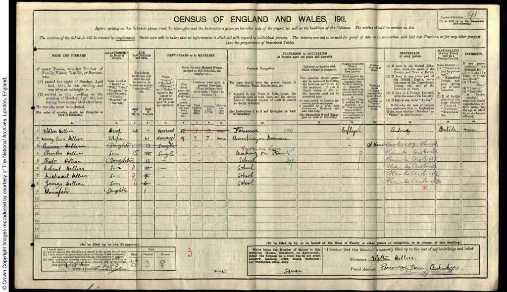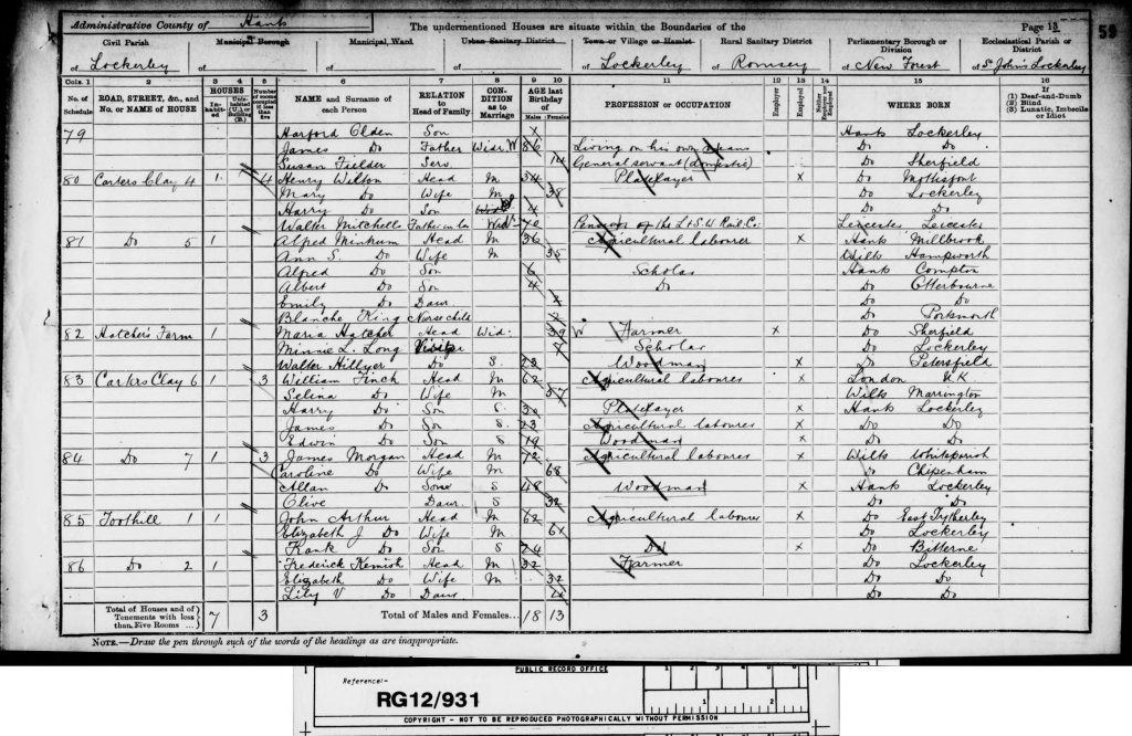 The census shows, Walter, Mary Ann, Annie, Frederick, Elizabeth Kate, Robert and Walters Father Walter, residing at, Parsonage Farm, Awbridge, Michelmersh, Romsey, Hampshire, England.
